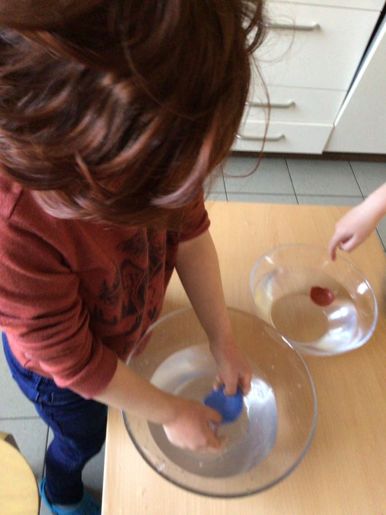 Wir haben uns mit schwimmen und sinken beschäftigt und eine Kugel aus Knete erst sinken lassen und dann konnte dieselbe Knete dann doch schwimmen.