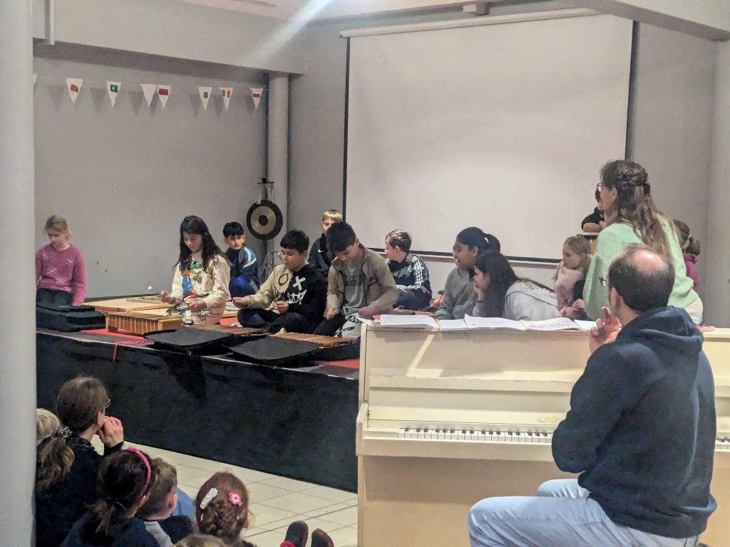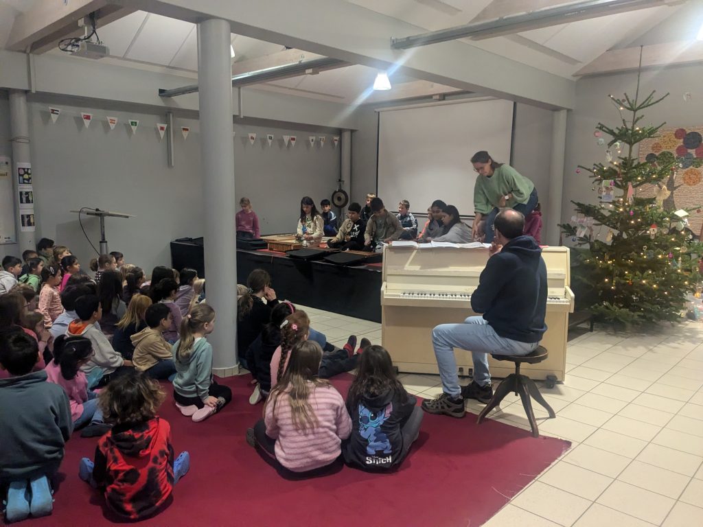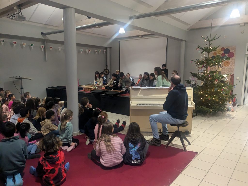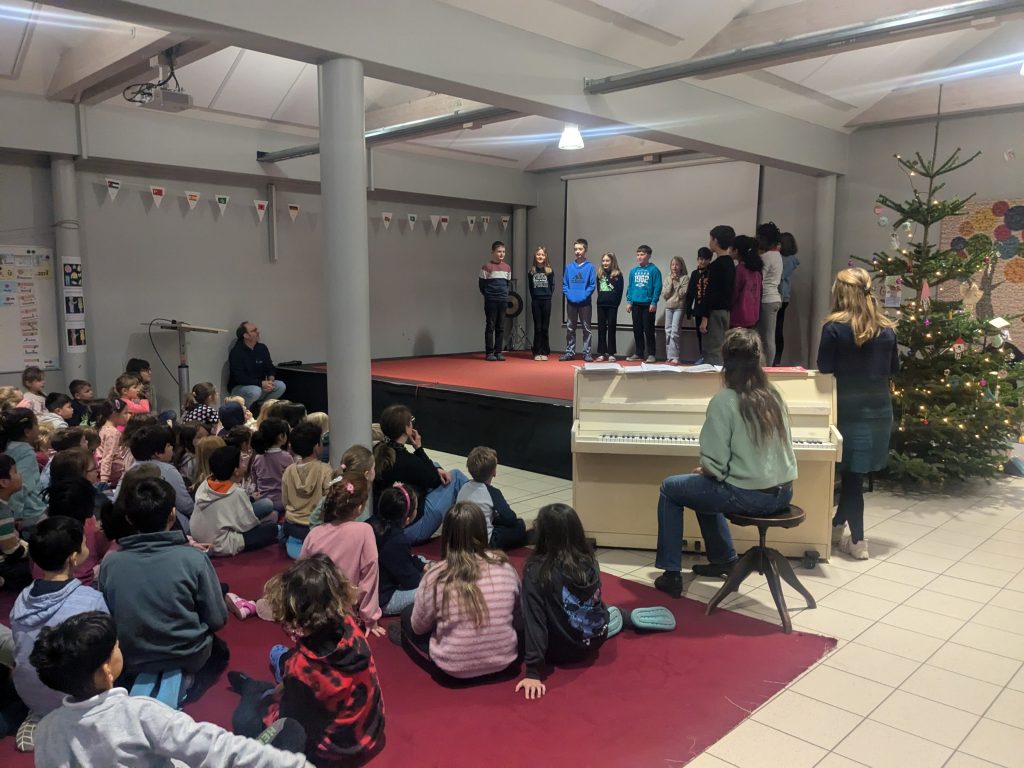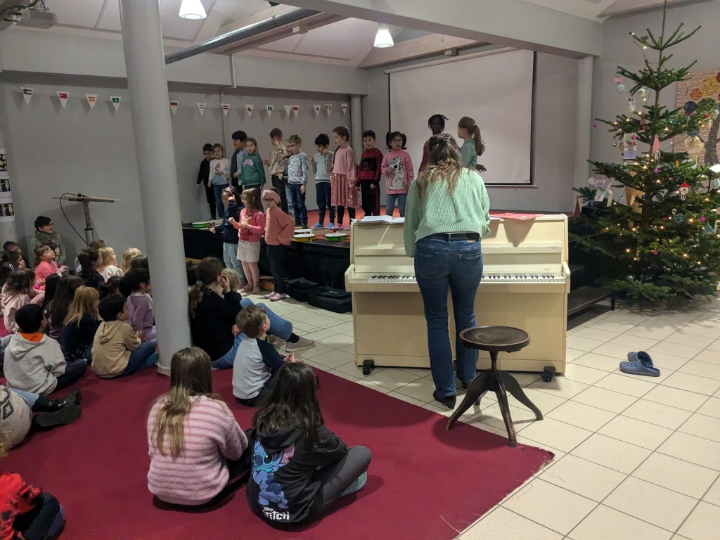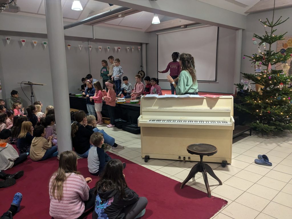 Die 4a beeindruckte mit einem Orchesterstück, bei dem Trommeln und Xylophone zum Einsatz kamen. Anschließend brachte die Klasse 4b mit ihrem Gedicht „Tannengeflüster“, das sie im Deutschunterricht vorbereitet hatten, den Zauber der Winterzeit in die Aula.