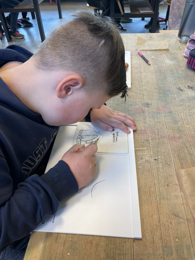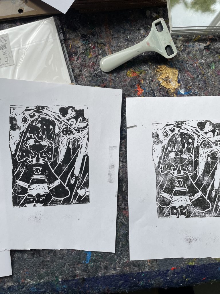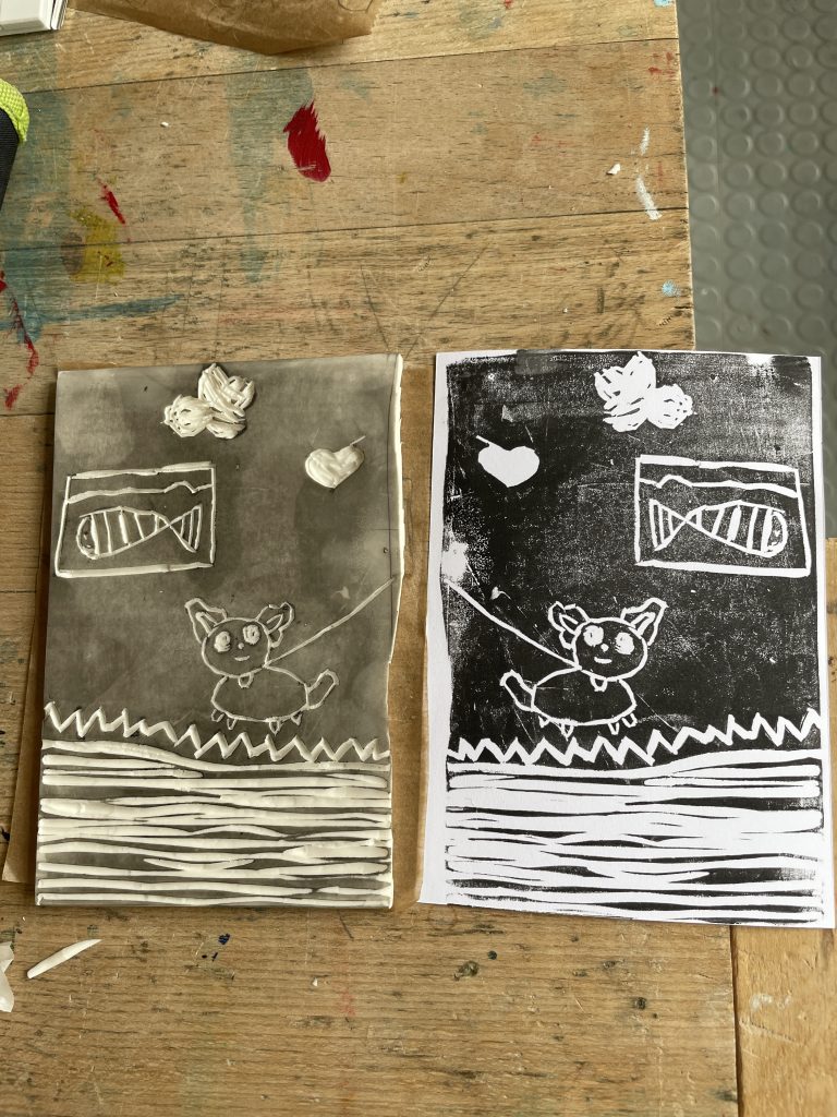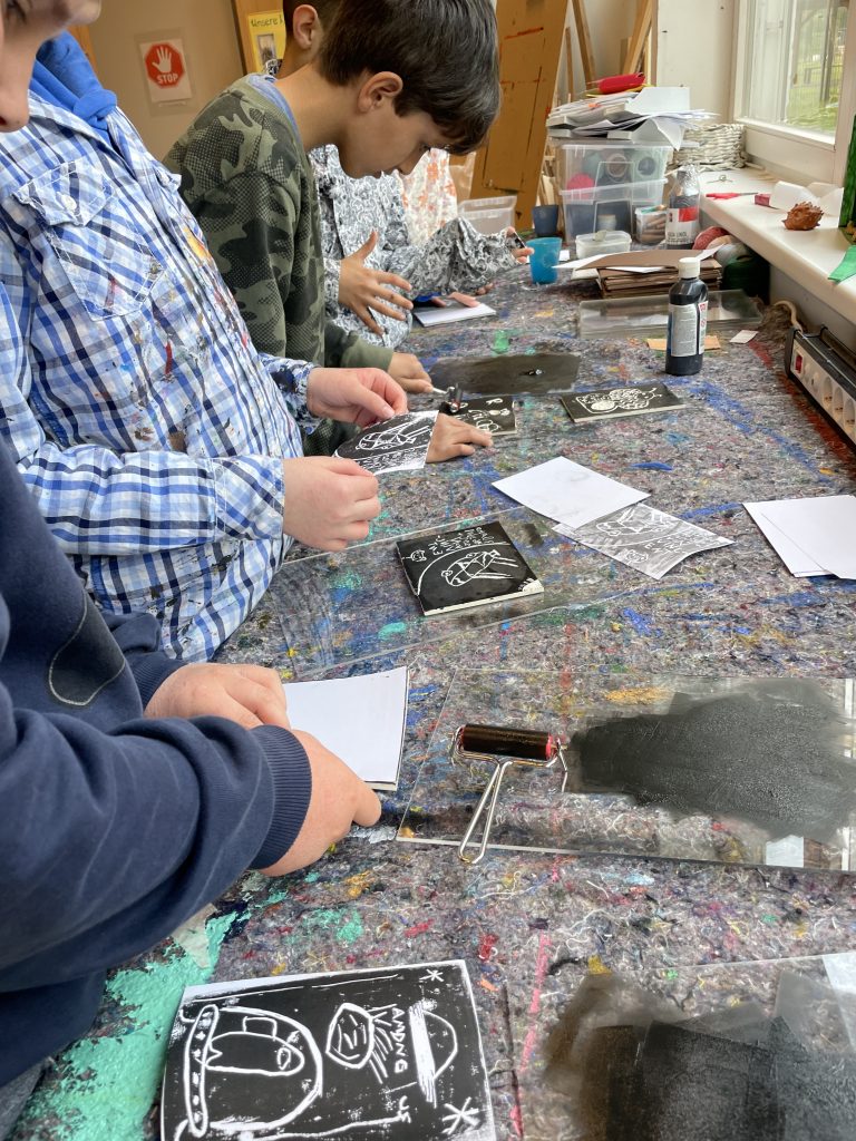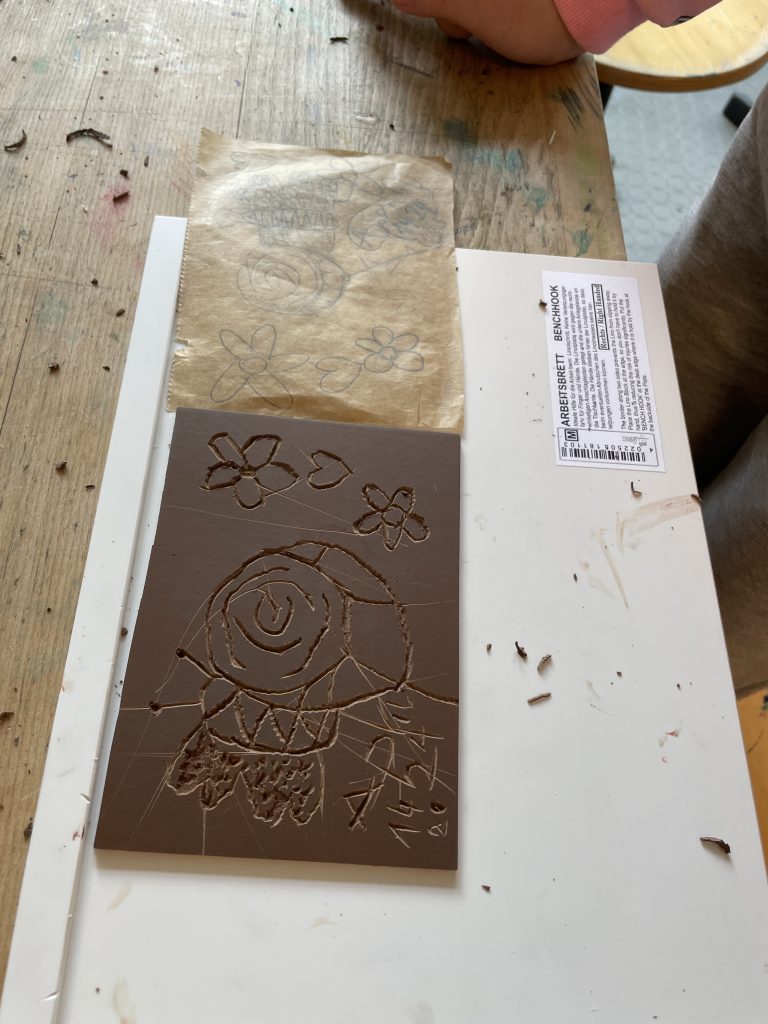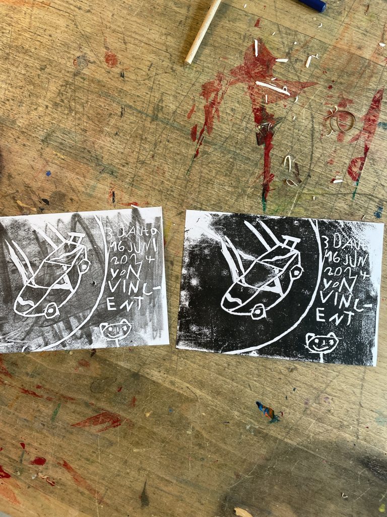 Ein Motiv war schnell vorgezeichnet und auf die Druckplatte übertragen. Das Schnitzen gestaltete sich dann schon herausfordernder. Je nachdem welches Material gewählt wurde (Linolplatte oder weichere Gummiplatte) musste mit ziemlich viel Kraft gearbeitet werden. Oft rutschte das Messer ab. Toll, dass trotzdem alle bei der Sache blieben und sich nicht entmutigen ließen! Ungeduldig wurde gearbeitet, weil das Bild doch endlich gedruckt werden sollte. Einige Male mussten Verbesserungen vorgenommen werden. Es war nicht so leicht sich vorzustellen, wie das Bild aussehen wird.