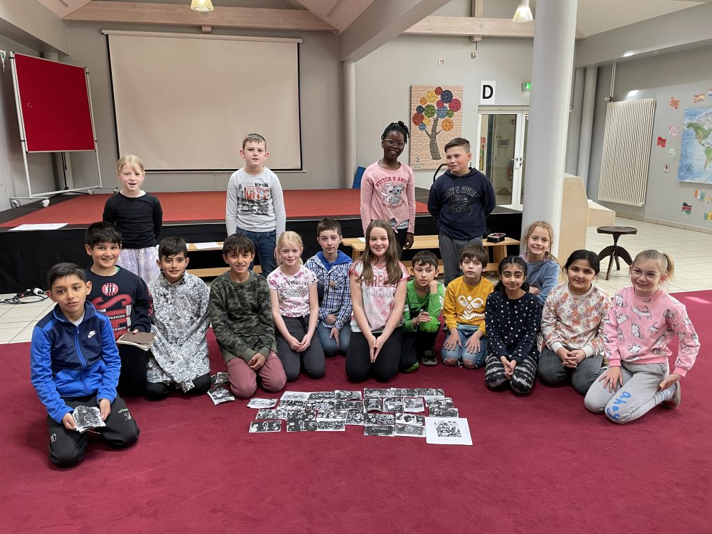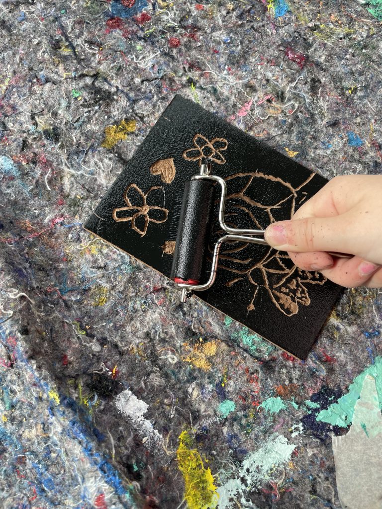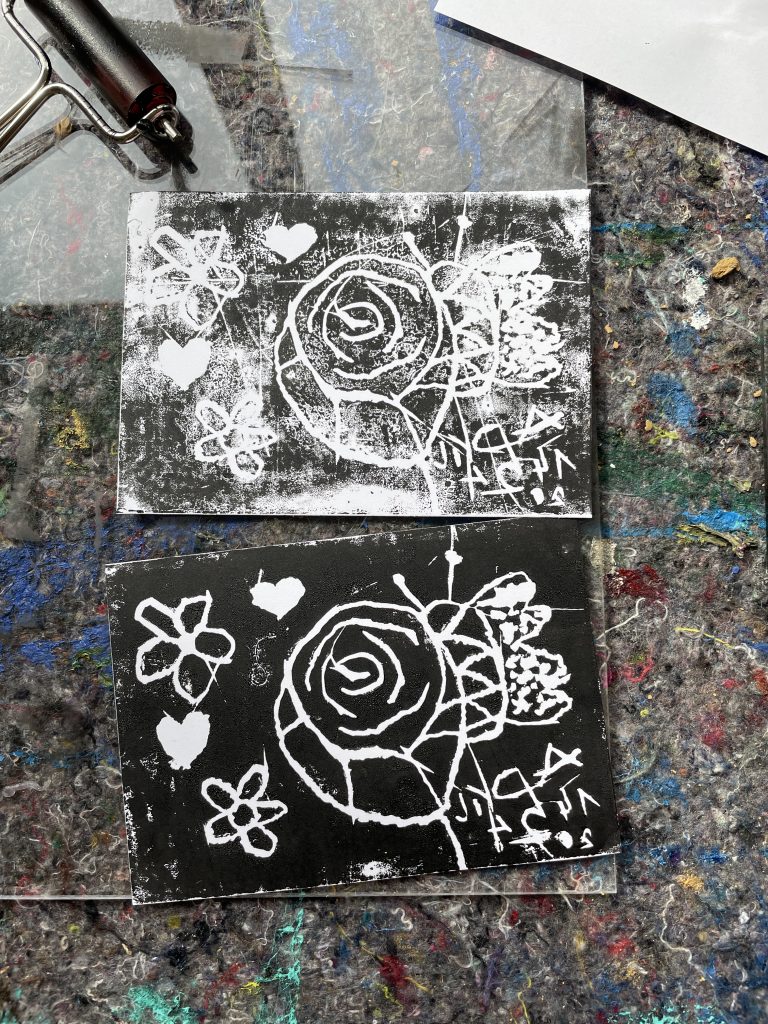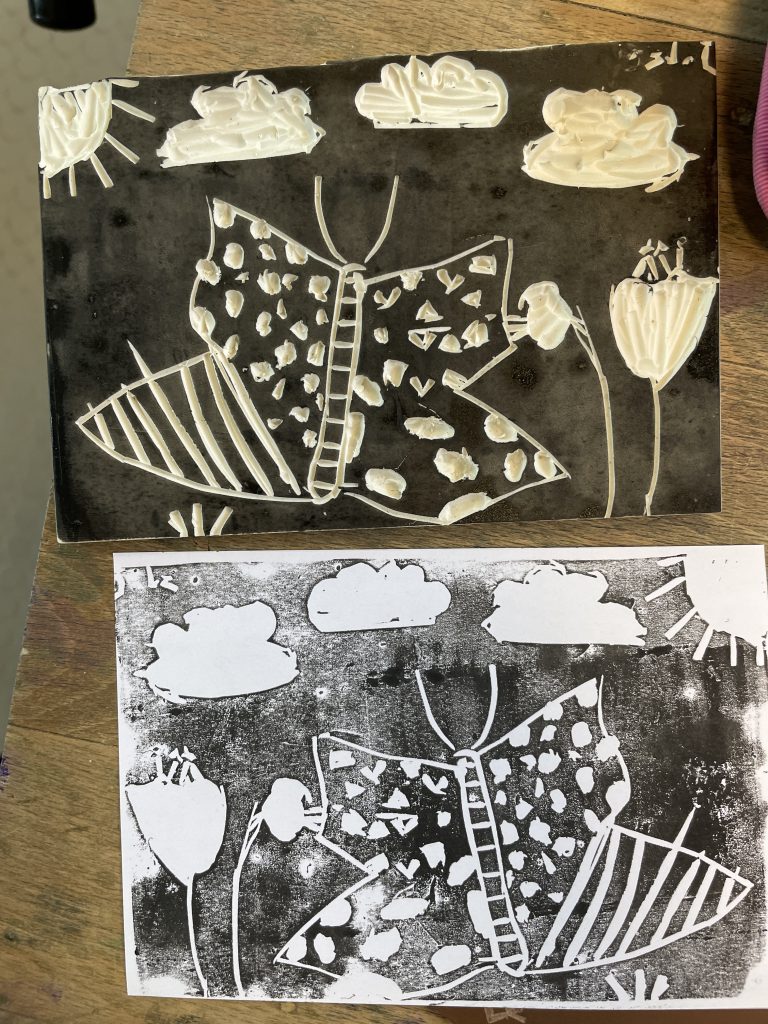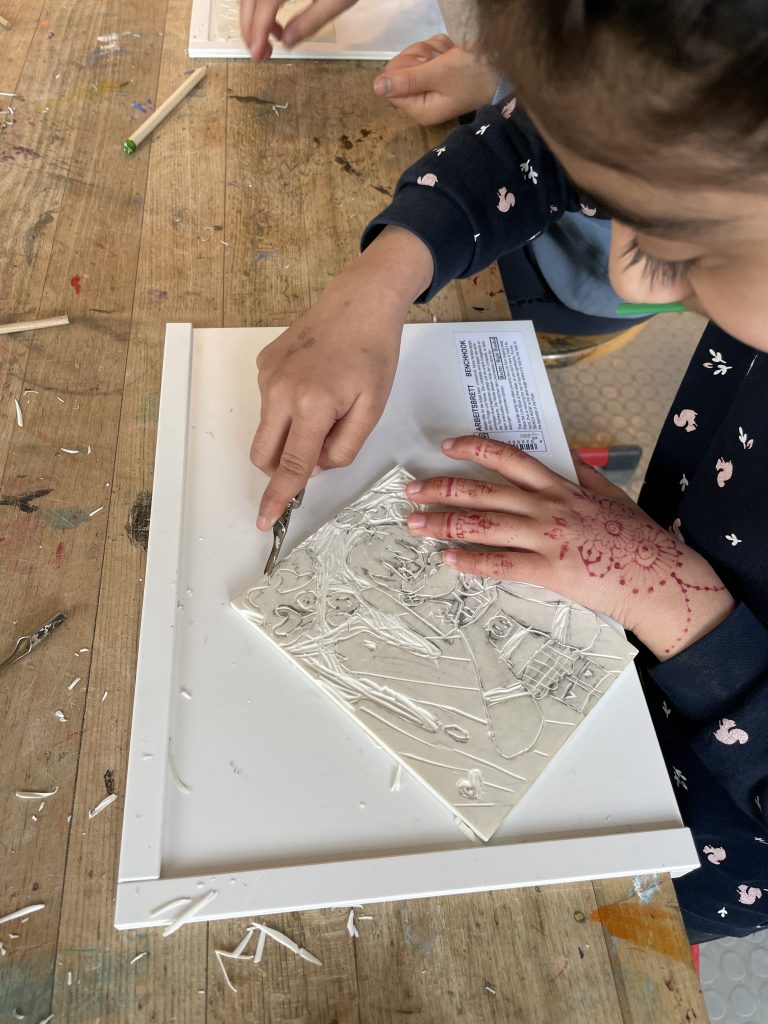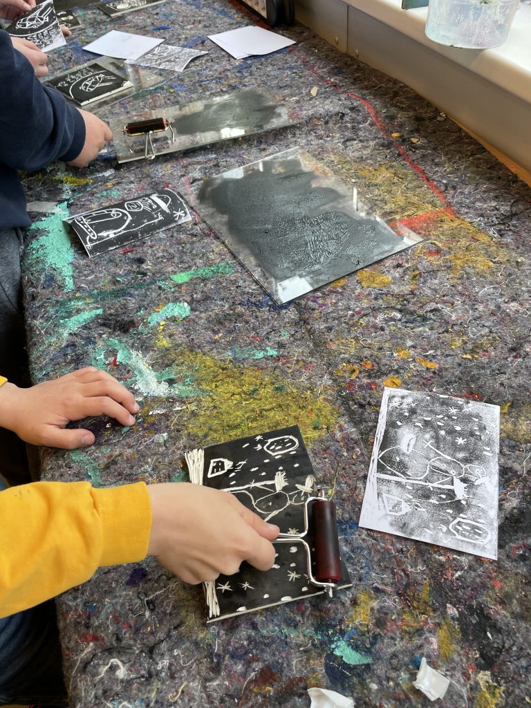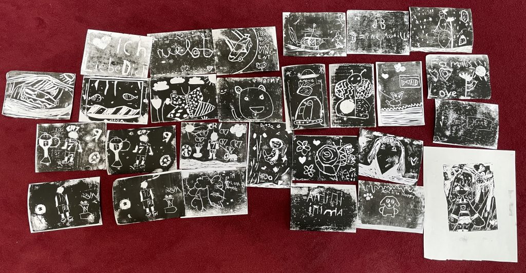 Dann war es soweit. Auf eine Plexiglasplatte brachten wir Farbe mit einer Rolle auf, um damit dann unsere Druckplatte einzufärben. Ein Papier auf die Platte gelegt, darübergerollt und abgezogen. Die Spannung war groß und die Begeisterung über das Ergebnis noch größer. Es sind so wunderbare Bilder entstanden. Vielen Dank, liebe Klasse 3b, der Vormittag mit euch hat großen Spaß gemacht!