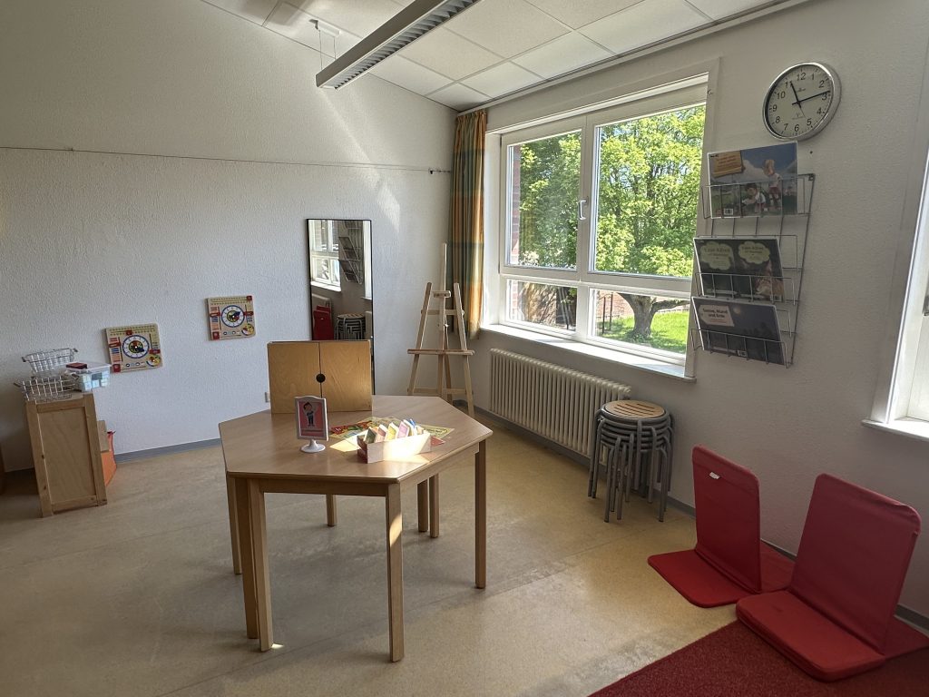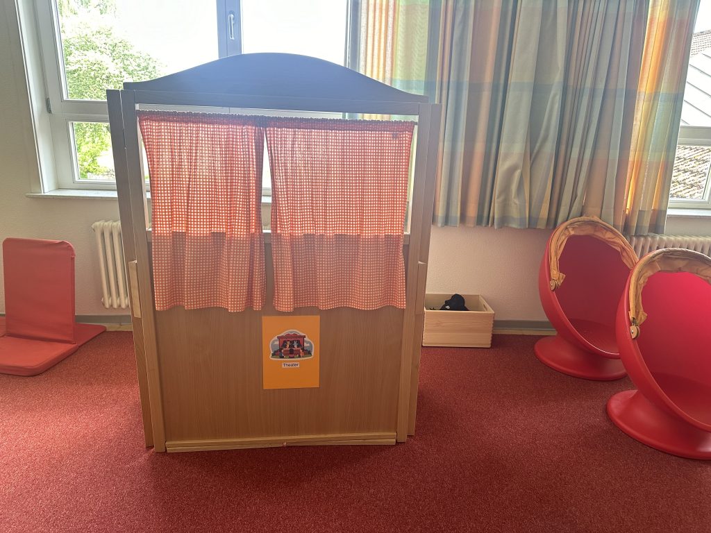 • Hier wird das Erzählen und Präsentieren von Geschichten geübt. Die Kinder können vor einem Spiegel üben, mit einer Geschichtenbaukiste kreativ werden, im Kaufmannsladen verschiedene Rollen einnehmen oder mit Kamishibais ihre Erzählfähigkeiten weiterentwickeln.