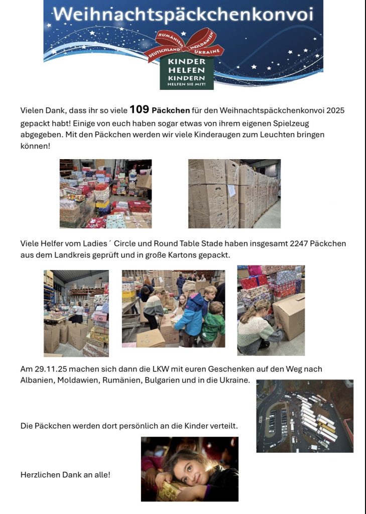 Gemeinsam mit den Helferinnen und Helfern des Ladies’ Circle und Round Table Stade wurden im gesamten Landkreis beeindruckende 2.247 Pakete gesammelt, geprüft und für den Transport vorbereitet. Am 29.11.2025 machen sich die LKW schließlich auf den Weg nach Albanien, Moldawien, Rumänien, Bulgarien und in die Ukraine, wo die Geschenke persönlich an die Kinder überreicht werden.